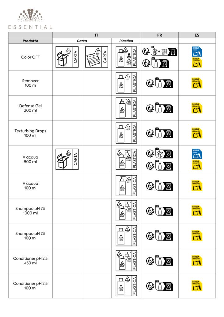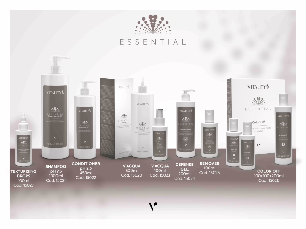 ESSENTIAL è la famiglia di prodotti professionali indispensabili in salone, da utilizzare in modo trasversale per i servizi tecnici
